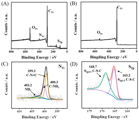 Subsequently, X-ray photoelectron spectroscopy (XPS) analysis was used to further verify the noncovalent boding of THI and rGO. In Figure 2A, the XPS spectrum of THI-rGO can be seen with peaks at 532.7, 400.1, 285.4, and 165.3 eV associated with O1s, N1s, C1s, and S2p, respectively [42]. However, no peaks assigned to N1s and S2p were observed in the XPS spectrum of rGO (Figure 2B). The atomic ratio of C to O in THI-rGO was significantly reduced compared with that of rGO, which was attributed to the oxygen in THI. The N1s deconvolution spectrum of THI-rGO (Figure 2C) revealed several chemical bonds for nitrogen: C–N=C (399.3 eV), C–NH2 (400.3 eV), and NH2 (403.2 eV). The S2p deconvolution spectrum (Figure 2D) displayed two components for sulfur bonds: S2p3/2 C–S–C (168.7 eV) and S2p1/2 C–S–C (165.2 eV) [43,44].