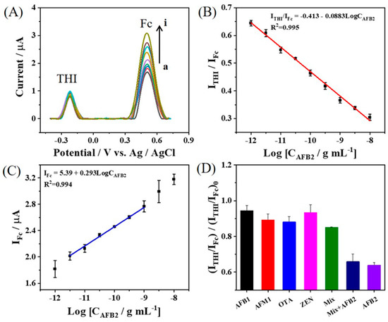 (A) ACV responses of the aptasensor to AFB2 with a concentration of (a–i): 0.001, 0.003, 0.01, 0.03, 0.1, 0.3, 1, 3, and 10 ng mL−1. Calibration plot of (B) ITHI/IFc and (C) IFc vs. the logarithm of the CAFB2. (D) Comparisons of the aptasensor responses to 0.01 ng mL−1 solution of AFB2 and 0.2 ng mL−1 solution of AFB1, AFM1, OTA, ZEN, and the mixture of the interferences.