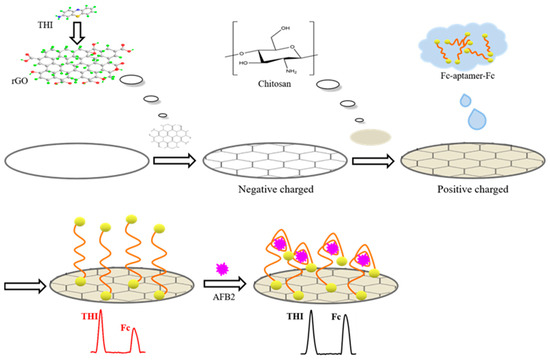 Inspired by these studies, our group has developed a ratiometric aptasensor using THI-loaded reduced graphene oxide (THI-rGO) as a substrate [30]. The disassociation of the Fc-tagged aptamer with complementary DNA in the presence of the target produces a reduced response current from Fc, offering a “turn-off” readout mode. In this study, in order to improve the analytical performance, we further developed a “turn-on” ratiometric electrochemical aptasensor via a relatively simple route for the sensitive detection of AFB2 (Scheme 1). The THI-rGO composite was electrostatically adsorbed on the surface of a glassy carbon electrode (GCE) and used as a substrate to output a reference signal, while the Fc-tagged aptamer was assembled on THI-rGO through electrostatic interaction [31]. In the analysis, the binding of AFB2 with the aptamer made Fc approach GCE. Consequently, IFc increased at higher AFB2 concentrations, while ITHI remained constant. This aptasensing assay using ITHI/IFc as a ratiometric signal showed high selectivity and sensitivity in AFB2 analysis.
