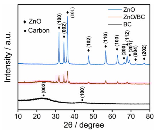 Figure 2 shows the XRD patterns of BC, ZnO, and ZnO/BC. The two slightly elevated diffraction peaks of BC at 23° and 43° belong to (002) and (100) refractions of the graphite planes [24]. The characteristic peaks of ZnO can all be found from in the spectra of ZnO/BC nanohybrid (PDF#89-0511) [25]. The diffraction peaks corresponding to BC and ZnO can also be found in the XRD patterns of the ZnO/BC nanohybrid. This confirms the successful synthesis of the ZnO/BC nanohybrid. To further demonstrate the elemental composition of the nanomaterial surface, XPS was performed to characterize the ZnO/BC. From the full XPS spectra of the ZnO/BC nanohybrid in Figure 3A, all the elements contained in the nanohybrid can be seen. It was proved that the synthesized material was pure. Figure 3B shows the C 1 s spectra at 284.7 eV, 286.2 eV, and 288.8 eV corresponding to C-C, C-O and C=O bonds, respectively. Figure 3C shows the O 1 s spectra at 531 eV, 531.62 eV and 532.48 eV corresponding to metal oxygen (ZnO), C=O and C-O/OH. Figure 3D shows the Zn 2p spectrum at 1022 eV and 1045.1 eV corresponding to 2p3/2 and 2p1/2 orbitals, respectively [26,27]. These data by XPS also illustrates the successful synthesis of the ZnO/BC nanohybrid.