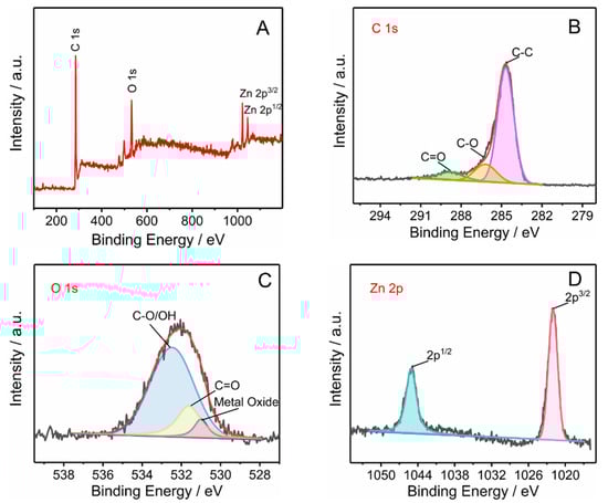 XPS survey spectrum of (A) ZnO/BC nanohybrid, core level spectra of (B) C 1 s, (C) O1 s, (D) Zn 2p.
