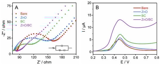As shown in Figure 4A, the Nyquist plots of the four modified electrodes were obtained from EIS in the presence of 5 mM [Fe(CN)6]3-/4- containing 0.1 M KCl. The resistance values (Rct) of bare, ZnO, BC, and ZnO/BC electrodes were 65.82, 58.23, 34.83 and 15.9 Ω respectively, indicating that ZnO/BC had the fastest electron transfer ability which would facilitate the accelerated oxidation of BPA on the electrode surface. The DPV diagram for the determination of BPA in Figure 4B showed that the electrochemical signal by ZnO/BC (8.181 µA) was larger than GCE (5.068 µA), BC (6.94 µA), and ZnO (6.055 µA). This suggested that the electrochemical response of ZnO/BC was stronger due to the synergistic effect of ZnO and BC, which is beneficial for the detection of BPA. The CV also demonstrated that the ZnO/BC had a better performance for the detection of BPA (Figure S2). This should also be attributed to the defects caused by the generation of oxygen vacancies in ZnO and the presence of defects in metal oxides that would create a deep energy level to capture electrons and lead to the production of a large number of freely movable electrons, and enhance the electron transfer rate of the material [28].