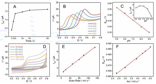 (A) Effect of adsorption time; (B) differential pulse voltammograms at different pH values; (C) point line graph of oxidation peak current (Ipa) vary with pH and the variation of peak potential (Epa) with pH. (D) Cyclic voltammograms of ZnO/BC sensor at different scan rates, (E) variation of Ipa with the scan rate (v), (F) variation of Epa with the natural logarithm of scan rate (lnv).