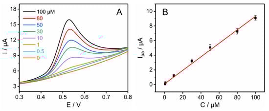 (A) DPV responses of the ZnO/BC sensor in different concentrations of BPA (50 mM PBS, pH 6.0). (B) Calibration curve for the determination of BPA (0–100 μM).