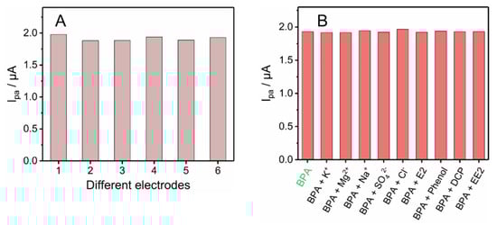 A good electrochemical sensor must have repeatability, stability, and anti-interference ability in order to be suitable for the complex situation of environmental pollution. To evaluate the reproducibility of the sensor, we used six independent glassy carbon electrodes to prepare ZnO/BC electrodes, and then detected the same concentration of BPA (20 μM) solution. As shown in Figure 7A, the electrical signals of the six independent electrodes were almost unchanged when detecting BPA, and the relative standard deviation (RSD) was calculated to be 4.3%, indicating that the ZnO/BC sensor had good reproducibility. To evaluate the stability of the sensor, it was stored at a low temperature of 4 °C. As shown in Figure S6, the electrochemical detection of BPA did not change significantly within one week, indicating that the sensor has high stability. It is modified using the drop coating method, so after the ZnO/BC solution is prepared it is not only extremely convenient to use, but also can be used many times. It only took 5 min to prepare a complete ZnO/BC electrode, and the solution was stored at 4 °C for 2 months without a signal drop.