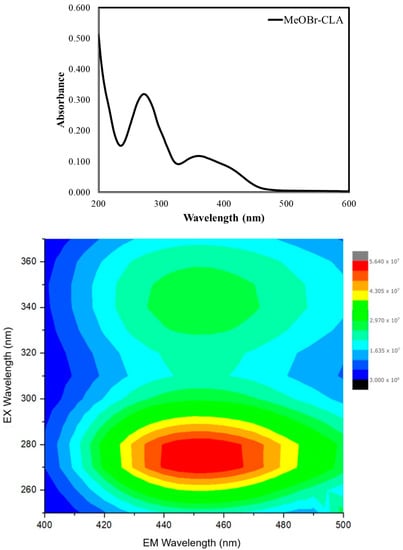 Absorption spectrum (top) and 2D EEM contour plot (bottom) for MeOBr-Cla (30 μM) in aqueous solution.