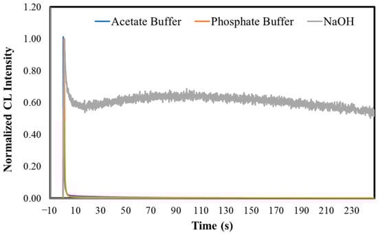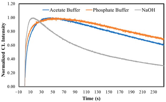 Normalized CL kinetic profiles for MeOBr-Cla in DMF with the addition of either sodium acetate buffer pH 5.2 (1%), phosphate buffer pH 7.4 (75 mM), or NaOH (0.1 M), measured with an integration time of 0.1 s (top). Normalized CL kinetic profiles for MeOBr-Cla in DMF with the addition of either sodium acetate buffer pH 5.2 (1%) or phosphate buffer pH 7.4 (75 mM), with an integration time of 1 s (bottom). All assays were performed with a final volume of 500 μL and a concentration of 10 μM of MeOBr-Cla.