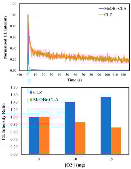 Nevertheless, to fully determine the potential of MeOBr-Cla to respond to superoxide anion, we must first compare its CL performance to that of native Clz. To that end, we also measured the CL kinetic profiles of Clz in aqueous solution with the addition of either sodium acetate buffer pH 5.2 (1%), phosphate buffer pH 7.4 (75 mM), or NaOH (0.1 M), in the presence of increasing amounts of potassium superoxide (5, 10, and 15 mg). The kinetic profile of Clz (at phosphate buffer pH 7.4 in the presence of 10 mg of potassium superoxide) is compared with that of MeOBr-Cla in the same conditions in Figure 2. The CL kinetic profile of Clz is quite identical to that of MeOBr-Cla at the same conditions, with both compounds following a flash-type profile with a quick burst of light followed shortly by decay to basal levels.