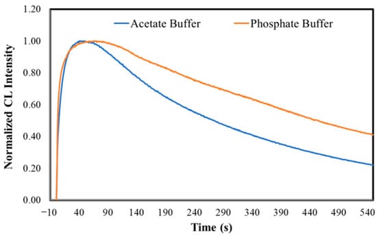 The half-time value of the CL reaction in DMF with the addition of NaOH (0.1 M) was 107.05 ± 14.70 s (Table 3). Interestingly, the typical measurement times (4 min with an integration time of 0.1 s) were not enough to allow for the determination of half-life values in DMF with the addition of either sodium acetate buffer pH 5.2 (1%) or phosphate buffer pH 7.4 (75 mM). Thus, the half-life for the CL reactions at these conditions was calculated by measurements for longer periods (15 min) and an integration time of 1 s (Figure 3 and Table 3). The half-life values are relevantly higher at acidic and neutral pH; nevertheless, the pH should not be the sole determining factor, as the half-life for neutral pH (546 ± 90 s) is relevantly higher than for acidic pH (251 ± 5 s). Thus, further exploration of this topic should be pursued in the future.