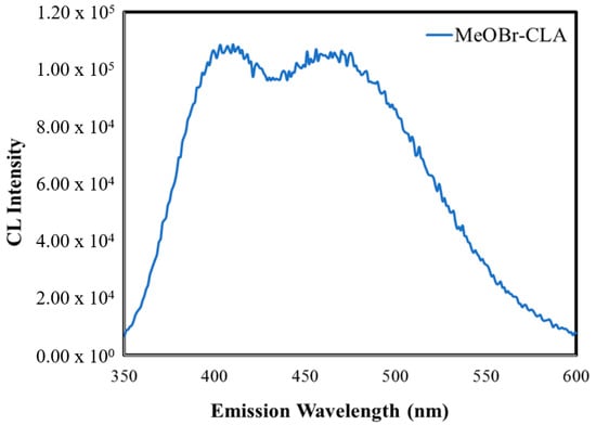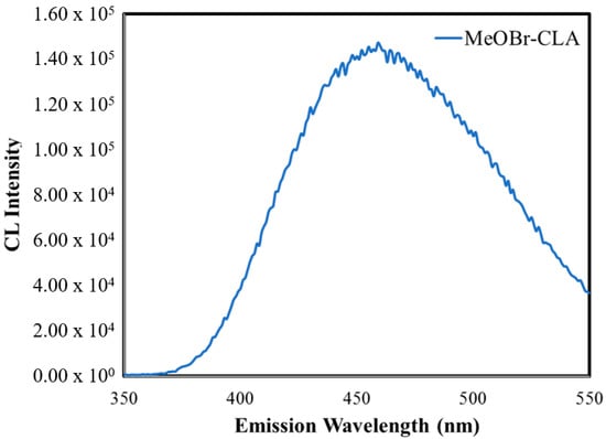 Finally, we have measured the CL spectra of MeOBr-Cla in DMF with the addition of either sodium acetate buffer pH 5.2 (1%) or NaOH (0.1 M), which are shown in Figure 4. The CL spectrum at acidic pH is composed of two somewhat overlapped bands, with emission maxima at ~410 and ~460 nm. At basic pH, the CL spectrum is just composed of a band at ~460 nm. This behavior indicates that the emission of the chemiluminophore (the Clmd version of MeOBr-Cla, Figure 1) is pH-dependent, which is not strange for imidazopyrazinones and can be attributed to the chemical equilibria of the amide group of Clmd (Figure 1) [22,41]. More specifically, at acidic pH, the neutral (emission at ~410 nm) and anionic amide species (emission at ~460 nm) of the Clmd version of MeOBr-Cla (Figure 1) should coexist, while at basic pH, deprotonation is complete, and only emission from the anionic amide species is observed. In fact, it has been found before that the CL spectra of native Clz in aprotic solvents are composed of one band at acidic pH (~475 nm), while increasing the pH leads to a red-shift in emission to ~515 nm, also attributed to the deprotonation of Clmd [41]. So, these results also indicate that the CL emission of MeOBr-Cla is blue-shifted with regard to native Clz.