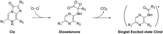 Interestingly, Clz can undergo CL in aqueous solutions in the presence of superoxide anion (Scheme 2) [31]. Superoxide anion acts as a trigger of the CL reaction, enabling the oxygenation step, thereby generating the dioxetanone intermediate and subsequently the chemiexcited Clmd chemiluminophore. This feature of the Clz system is quite interesting due to the biological roles that the superoxide anion can play. Namely, the superoxide anion and other reactive oxygen species (ROS) are involved in intra- and intercellular signaling pathways, affecting several cellular events such as cell proliferation and apoptosis [32]. Furthermore, while the quantity of superoxide anion and other ROS is typically regulated by the enzymatic machinery of cells, an unbalance can lead to deleterious health conditions such as inflammation and cancer [33]. This loss of the enzymatic ability to produce superoxide anion could also lead to chronic granulomatous disease [34]. Given this, it is not surprising that different authors have been trying to utilize Clz and derivatives as CL-based chemosensors for superoxide anion determination in general, and in biological media specifically [29,35,36,37]. These studies have then validated the use of Clz as a reliable approach for the sensitive and dynamic sensing of superoxide anion [29]. However, CL reactions tend to possess lower light-emitting intensities in aqueous solution due to energy loss to water molecules [38,39], and Clz is not an exception [28]. Thus, superoxide anion sensing would benefit from Clz-based CL reactions with enhanced emission in aqueous solutions.