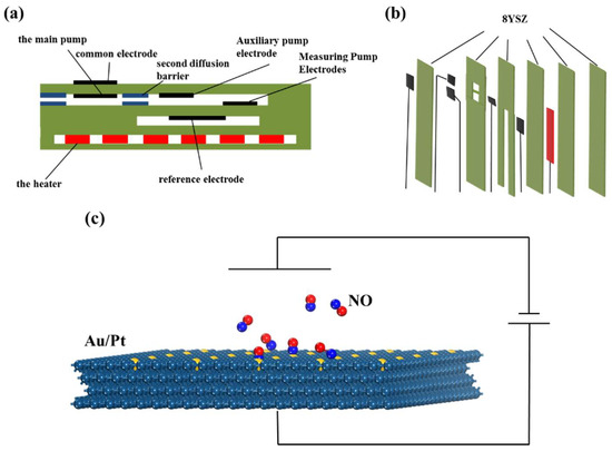 In recent years, a rapid increase in automobile production and the demand for better consumer products has been observed, leading to a drastic impact on the environment due to exhaust emissions from automobiles and factories. NOx is among the major contributors of air pollution owing to its highly toxic nature. It is very dangerous for human health [1], as well as the environment [2], ecology [3], and social economy [4]. Therefore, governments’ emission regulations for automobile exhaust are becoming more and more stringent. To further reduce vehicle exhaust emissions and improve fuel efficiency, the sensor that can monitor the real-time NOx in automobile engines and electronic control systems has become an indispensable part of the lean burn control system. The current-mode NOx sensor is the only commercial NOx sensor that has been used in automobile selective catalytic reduction systems (SCR) [5]. Its detection principle is explained in the following text. There are two kinds of gas-sensing electrodes in the structure of the current-mode NOx sensor, as shown in Figure 1. One is the main pump electrode, and the other is the auxiliary pump electrode, which is located in the front middle of the sensor. Because the concentration of the O2 automobile exhaust is usually measured in terms of percentage of total contents, it causes great interference when measuring the ppm of NOx. Therefore, the purpose of the main pump electrode and the auxiliary pump electrode is to pump O2 out of the tail gas under the operation of external voltage, reducing its concentration to the level of 1 × 10−6 without decomposing NOx. The other is the measuring pump electrode, in which the remaining NOx in the tail gas is reduced to N2 and O2− at the measuring pump electrode under the operation of external voltage. Under the action of an electric field, O2− migrates through the solid electrolyte YSZ to the external anode to form a current. According to Faraday’s first law [6], the concentration of NOx in the gas can be obtained by measuring the current.
