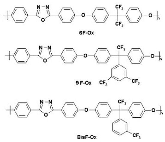 The investigated fluorinated 1,3,4-oxadiazole assemblies, BisFOx, 9FOx, and 6Fox, were obtained via the aromatic nucleophilic substitution reaction of 2,5-bis(p-fluorophenyl)-1,3,4-oxadiazole with fluorinated bisphenols, as previously reported in the literature [39]. The nucleophilic substitution reaction between an aryl halide and a phenoxide is the most common method of synthesizing poly(aryl-ether)s. The polycondensation reactions have been performed in NMP solvent, using anhydrous potassium carbonate as the catalyst, and were performed at elevated temperatures. The 1,3,4-oxadiazole units in these compounds act as an activating group that receives a negative charge and thus causes the activation energy to decrease for the displacement of the p-substituted fluorine group by a Meisenheimer complex, similar to other activating groups, including ketone or sulfone [39].