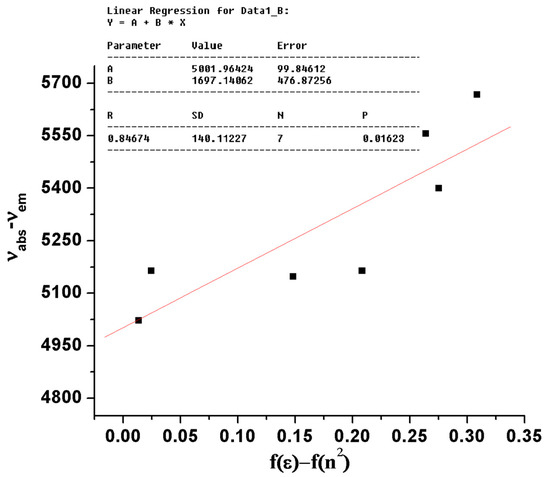 where (cm−1) and are the wavenumber of the absorption maximum and transition dipole moment, respectively, which is defined by the oscillator strength f, Equation (2): x—the direction of charge transfer: