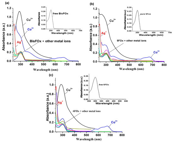 Absorption changes of (a) BisFOx, (b) 9FOx, and (c) 6FOx samples, when adding 1500 µL of various interfering ions (Mg2+, Mn2+, Ni2+, Cd2+, Zn2+, Co2+, Cu2+, Hg2+, Sn2+, and Ag+). The inset shows the absorption spectra of the free BisFOx, 9FOx, and 6FOx, in THF solution.