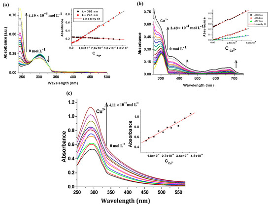 Plots depicting the effects of increasing amounts of (a) Ag+, (b) Co2+, and (c) Cu2+ metal ions on the absorption spectra for the BisFOx sample (c = 1 × 10−5 mol L−1), in THF solution. Insets: The plot depicting the linear proportional relationship between the absorbance and the concentration of the Ag+, Co2+, and Cu2+ ions.