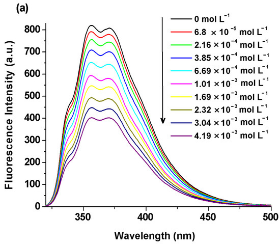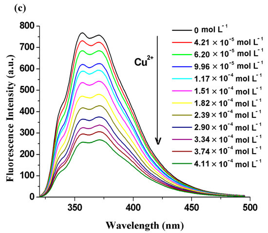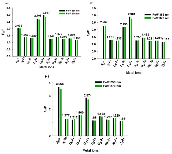 Furthermore, the sensing abilities of the BisFOx and 9FOx derivatives for Mg2+, Mn2+, Ni2+, Cd2+, Zn2+, Co2+, Cu2+, Hg2+, Sn2+, and Ag+ ions, in THF solution were evaluated using their fluorescence spectra. The intensity of the emission bands (at 356 and 370 nm) were moderately quenched (FIQ—fluorescence intensity quenching) along with an increasing concentration of Ni2+, Cd2+, Hg2+, Mn2+, Sn2+, and Zn2+, but remarkable changes were recorded after gradually adding Ag+, Co2+, and Cu2+ ions (see the values for F0/F, from Table 2 and Figure 5). The spectral variations observed in the fluorescence spectra of the BisFOx sample, upon the addition of incremental amounts of Ag+, Co2+, and Cu2+ cations, are illustrated in Figure 5a–c. Similarly, the fluorescence intensities at 356 and 370 nm were reduced to the same extent for the 9FOx and 6FOx systems, in the presence of incremental amounts of Ag+, Co2+, and Cu2+ ions, as for the sample BisFOx (see Figures S3 and S4, from the Supplementary Material).
