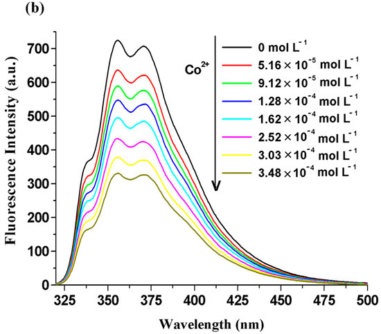 Additionally, notable modifications in the absorption spectral profile were observed when Co2+ ions (0–1500 μL) were added to the solution of the BisFOx sample; i.e., the intensity at = 302 nm gradually increased, accompanied by the appearance of a new band (550–700 nm) with λmax at 674 nm and a weak shoulder at 570 nm (Figure 4b), the intensity of which increased with an increasing concentration of Co2+ ions. Moreover, this new absorption band was probably due to BisFOx-to-metal charge-transfer (LMCT), rather than Co-based d–d transitions [50]. Instead, as shown in Figure 4b, the absorption band intensified (even for the whole spectrum) when the BisFOx sample was titrated with Co2+ ions (the opposite trend was observed after titration with Ag+). This behavior could be the result of electronic changes as a result of the creation of coordination bonds and/or deprotonation. Table 2 summarizes the changes in the absorption and fluorescence spectra of the BisFOx and 9FOx samples after titrations with 1500 µL of different metal ions (also shown in Figure 3).