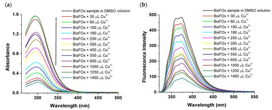 Absorption (a) and emission spectra (b) of the BisFOx compound (c = 1 × 10−5 mol L−1), in DMSO solution, after titration with incremental amounts of Cu2+ ions.
