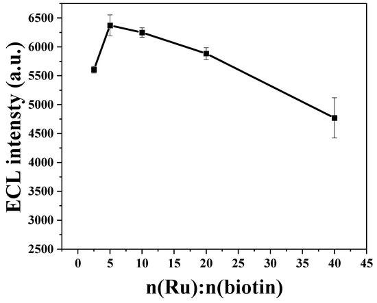 Therefore, the labeling ratio of biotin and Ru(bpy)32+ needed to be further explored to optimize the signal amplification efficiency. Based on this idea, different ratios of biotin and Ru(bpy)32+ (molar ratios of 1:40, 1:20, 1:10, 1:5 and 1:2.5, respectively, fixing the amount of Ru(bpy)32+) were mixed with phage display affibodies with the same titer and amount, respectively. After adequate reaction and dialysis, several groups of labeled samples were incubated with streptavidin-coated magnetic microspheres for 30 min to examine the difference in ECL intensity. The principle of this method (Figure S4 in Supplementary Materials) is that the proportion of biotin determines the number of phages bound to the magnetic microspheres at the same time, while the proportion of Ru(bpy)32+ determines the intensity of the ECL signal for the same number of phages. Therefore, this method allows the combined effect of both to be determined. As shown in Figure 1, the strongest ECL response was observed when n(biotin): n(Ru) = 1:5, and therefore, the phage display affibodies used in the sensor were prepared based on this ratio. It should be noted, however, that this value is the ratio of reactants and not the ratio of two molecules linked with phage capsid proteins. This characterization can also demonstrate that the phage display affibodies were labeled with both Ru(bpy)32+ and biotin.