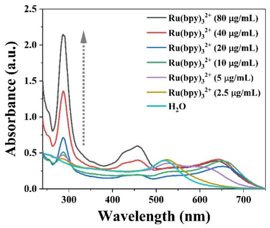 It can be found that there is a characteristic peak at 520 nm, which is the typical absorption peak of AuNPs originating from surface plasmon resonance [35,36]. When the frequency of incident light and the vibration frequency of the conduction band electrons are the same, there is a distinctive characteristic peak in the visible light (510~550 nm) region, and the position of the absorption peak and the particle size of AuNPs have obvious correlation [37]. According to this feature, the increase in particle size will lead to the red-shift of the absorption peak, and the aggregation of AuNPs will also cause a significant color change. With the increase in the concentration of Ru(bpy)32+, the characteristic peak at 520 nm kept decreasing, which means that monodisperse AuNPs were decreasing, and the peak basically disappeared when the concentration was 20 μg/mL. In contrast, the peak gradually shifted red, and a new distinctive peak appeared at about 650 nm, which was the newly formed AuNPs@ Ru(bpy)32+ with the aggregation of AuNPs, and its absorbance value reached stability at the Ru(bpy)32+ concentration of 40 μg/mL. Therefore, this ratio can be chosen for the preparation of AuNPs@ Ru(bpy)32+.