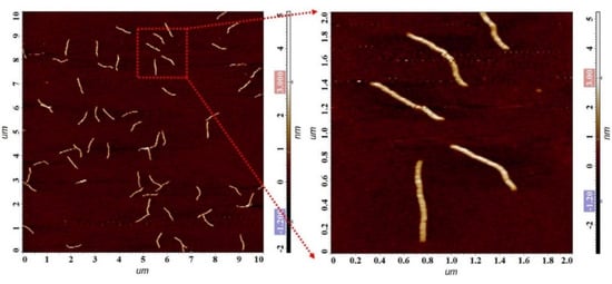 M13 phage is a kind of filamentous virus. Due to the destructiveness of high-energy electron flow to biomaterials and the limitation of phage size, an atomic force microscope (AFM) was used to characterize the morphology and structure of phage display affibodies. As shown in Figure 3, M13 phages were evenly adsorbed on the surface of silicon wafer, showing an obvious long, strip-shaped, flexible structure with a length of less than 1 μm and a diameter of less than 10 nm. It should be noted that the affibody fragment is displayed at one end of M13 phage and cannot be captured and shown via AFM images. This invisible segment determines the specific recognition and binding of phage display affibodies to the target, and the visible part of M13 phage in the microscopic image can be used as the carrier of nanomaterials for signal amplification of the ECL biosensor.
