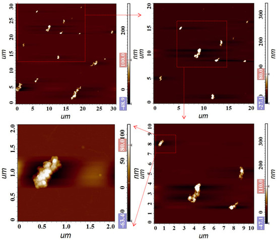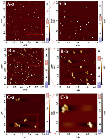To determine whether AuNPs@Ru(bpy)32+-SA could be successfully loaded on the surface of the dual-labeled phage display affibody, appropriate proportions of both were mixed and rotated vertically for 1 h. The mixture was added dropwise and adsorbed on the silicon wafer and observed via AFM (Figure 7). It was found that the AuNPs@Ru(bpy)32+-SA formed obvious large-sized composites compared to the monomer and showed a long, strip-like distribution, indicating that they had been successfully attached to the M13 phages. This result proved that the key structure of the sensing model was successfully constructed and also laid the foundation for the signal amplification of abrin detection.