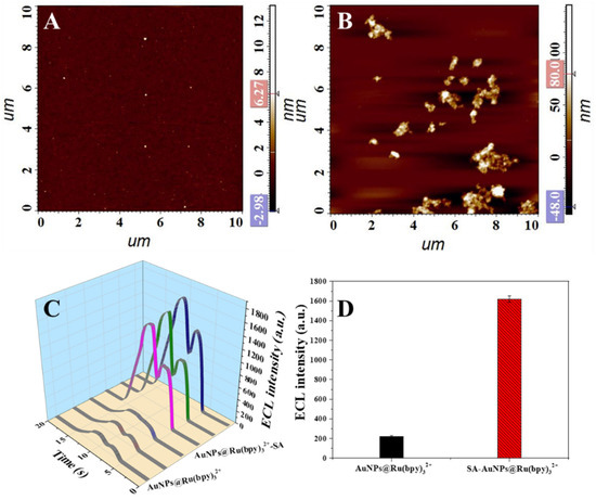 In addition, we examined the electrochemiluminescence properties of gold nanocomposites. Firstly, an excess of biotin-labeled M13 phages were mixed with streptavidin-coated magnetic microspheres for 1 h, and magnetic microspheres with a large number of biotin molecules were obtained after sufficient washing. Then, the microspheres were divided equally into two groups; one group was added with AuNPs@Ru(bpy)32+ suspension and another group was mixed with the same concentration of AuNPs@Ru(bpy)32+-SA suspension. After 30 min of reaction and thorough washing, the magnetic microspheres were used for ECL characterization, and the results are shown in Figure 6C,D. It was found that the two groups of samples had extremely significant ECL signal differences, which also indicated that streptavidin was successfully linked to AuNPs@Ru(bpy)32+ and AuNPs@Ru(bpy)32+-SA was prepared successfully.