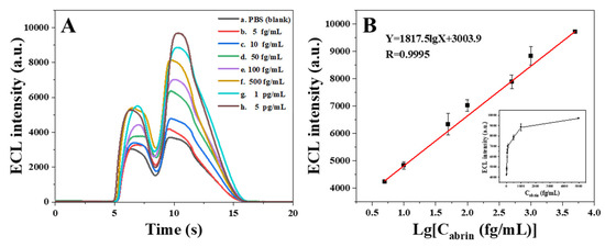 Abrin, extracted from the seeds of Abrus precatorius, is one of the most dangerous lethal biotoxins [1,2,3]. It may not only cause accidental harm to human bodies, but can also be used to commit murders and terrorist attacks, posing a serious threat to the public safety of society [4,5]. Like most protein toxins, abrin is colorless, relatively stable and without specific elements and chemical groups, thus difficult to identify with general physical, chemical and biochemical methods, so there is an urgent need to develop accurate and sensitive detection methods. With electrical signal as the input signal and optical signal as the detection signal, the electrochemiluminescence biosensor has the remarkable features of low background interference, high signal resolution, good stability, high sensitivity, controllability and high detection efficiency and is a good choice for the detection of abrin [6,7]. Compared with other biosensors or bioassays, such as ELISA [8,9,10], fluorescence [11,12,13], immunochromatography [14], piezoelectricity [15], Raman scattering [16], mass spectrometry [17] and radioimmunoassay [18], it has shown higher sensitivity in abrin detection and is a very promising biosensing method.