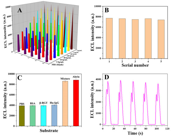 The stability of the sensor for the abrin sample (5 fg/mL) was tested, and the results are shown in Figure 9D and Figure S5 (Supplementary Materials). As can be seen in Figure 9, the sensor had good detection stability in five detection cycles. However, the subsequent detection results continued to decline steadily (Figure S5), which is due to the fact that each cycle required the consumption of co-reactants in the detection fluid. In the case of excess co-reactants, the measured values can remain stable, but when the co-reactants are consumed, the detection value will decrease with the reduction in luminescence efficiency. In fact, in the actual detection process, only the first peak was used as the standard detection value, and the subsequent luminescence did not affect the detection results.