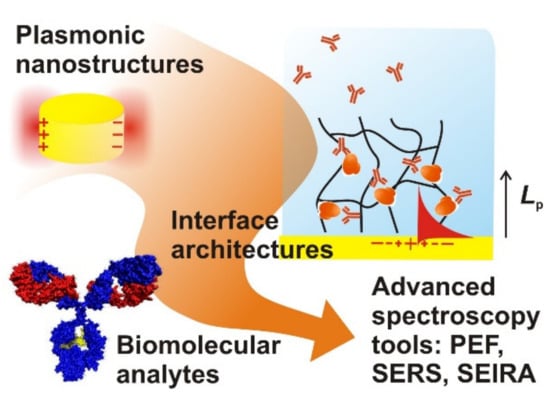 Plasmonics represent a field of nano photonics that concerns tight confinement of light intensity on surfaces of metallic nanostructures and thin metallic films [7]. This phenomenon is associated with the excitation of surface plasmon (SP) modes that originate from coupled collective oscillations of the electron density and associated electromagnetic field at the metal surface. The optical excitation of the confined field of SPs is accompanied by strongly enhanced electromagnetic field intensity |E/E0|2 and local density of optical states. Plasmonics has been used for surface plasmon resonance–SPR–biosensors as well as for the amplification in numerous spectroscopic techniques (see Figure 1), including surface-enhanced Raman spectroscopy-SERS, surface-enhanced infrared absorption spectroscopy-SEIRA, and surface plasmon-enhanced fluorescence-PEF [8,9,10,11]. In PEF affinity biosensors, fluorophore labels are used as tracers of the specific analyte capture and their coupling with the intense field of SPs allows for increasing the sensitivity of assay readout to rapidly detect trace amounts of molecular analytes present in analyzed samples. The enhancement factor of emitted fluorescence light intensity (per attached fluorophore label) typically reaches values up to 102 and several works [9,12] show even higher amplification factors exceeding 103. PEF takes advantage of the interaction between intense SP field and fluorophore emitters at their absorption and emission wavelengths that (locally within the SP probing depth Lp) increases the excitation rate, enhances quantum yield, and improves extraction efficiency of fluorescence light from the sensor surface. Various lithographically prepared metallic nanostructures have been used for signal amplification including thin metallic films with arrays of nanoholes (NHA) [13,14], nanoparticle arrays (NP) [15], and combined materials [16,17] that support a rich spectrum of interacting propagating surface plasmons (PSPs) and localized surface plasmons (LSPs). It is worth noting that plasmonic structures that provide significantly stronger field enhancement |E/E0|2 through tighter confinement of light intensity (probing depth Lp < 10 nm on e.g.,: narrow gaps between nanoparticles [18]) are typically not suitable for fluorescence enhancement due to the competing effect of quenching. However, such plasmonic nanoparticle geometries are attractive for SERS measurements that are increasingly utilized for vibrational spectroscopy-based analysis of trace amounts of molecular analytes. Similarly to PEF, the plasmonic nanostructures need to be adjusted to support strongly locally enhanced field intensity at spectral regions that match the incident probing laser wavelength and overlap with bands, where (Stokes or anti-Stokes) Raman scattering bands occur [19,20].
