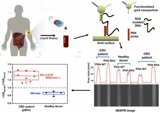 Surface plasmon resonance imaging biosensor for liquid biopsy–based diagnosis of colorectal cancer. Reproduced from Biosensors and Bioelectronics, vol 170, D’Agata et al. Direct plasmonic detection of circulating RAS mutated DNA in colorectal cancer patients, 2020 [22] with permission from Elsevier.