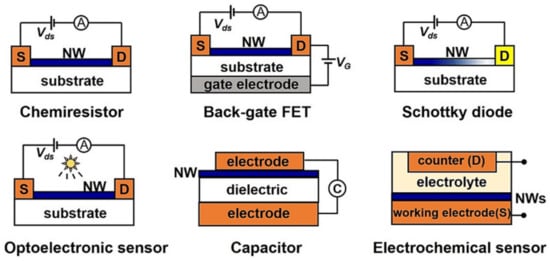 FETs are semiconducting devices–also called unipolar transistors–since they only depend on the majority carrier in the semiconductor to finally become conductive. Their low cost, low volume, and low weight, as well as their excellent integration possibilities in portable electronic devices, make them ideal candidates for point of care medical applications. They can be used as biosensor materials since binding of analytes to the semiconductor surface influences the behavior with which they react to application of the gating voltage with direct correlation to the analyte concentration, charge, and molecular weight. FET type sensors can be used in gaseous or liquid media for the detection of biochemical markers or the detection of environmental pollutants [31].