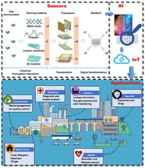 Schematic overview of smart sensor systems from the transduction of sensor signals, via the artificial intelligence and IoT connection for applications in various sectors. Adapted from [78].