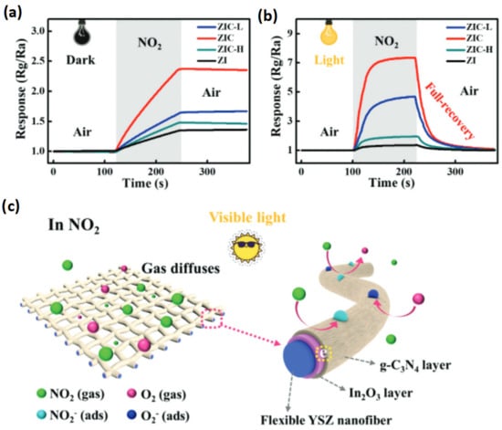 (a) The dynamic response curves of visible light powered, flexible ZI, ZIC-L, ZIC, ZIC-H sensors to 1 ppm NO2 at room temperature in dark, (b) under visible-light illumination. (c) Schematic diagrams of the NO2 detection process with visible-light illumination, oxygen molecules in air freely diffuse through the porous structure of the ZIC networks. Adapted from [85].