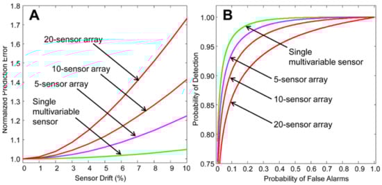(A) Demonstration of the sensor prediction rate error increase with increasing sensor drift for the comparison of arrays and multivariate sensors. (B) Probability of detection against false alarm predictions for multivariable sensors against sensor arrays. Figure from [161].