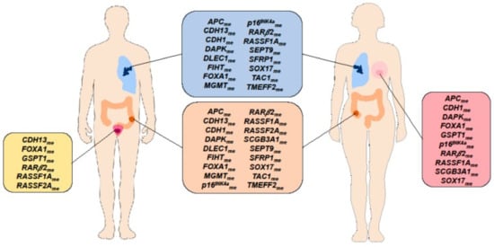 Circulating cell-free DNA methylation-based biomarkers described in literature for cancer detection which are common to at least two cancer types [Breast Cancer (pink box), Lung Cancer (blue box), Prostate Cancer (yellow box), Colorectal Cancer (orange box)]. Reprinted with permission from [189]. 2020, Cells, MDPI.
