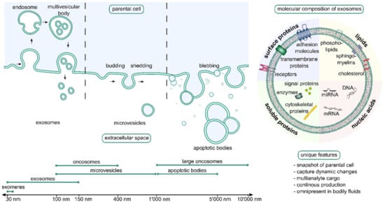EVs is an umbrella term for a heterogenous group of membranous vesicular structures, released to virtually all human bodily fluids. As EVs represent vehicles for the transfer of molecular cargo including proteins, DNA fragments, different RNA species, metabolites, and lipids, according to their role in intercellular communication, their cargo is also representative for the physiological (or pathological) state and origin of the releasing cell and therefore make them ideal biomarker candidates for minimally invasive systemic disease diagnostic purposes. A further plus is that EV cargo biomolecules are most efficiently protected from enzymatic degradation in bodily fluids and that, for example, tumor cells may release up to 10-fold more EVs than released by healthy cells. A commonly accepted classification divides EVs into three groups based on their distinctive biogenesis pathways: apoptotic bodies, microvesicles, and exosomes (see Figure 11) [211].