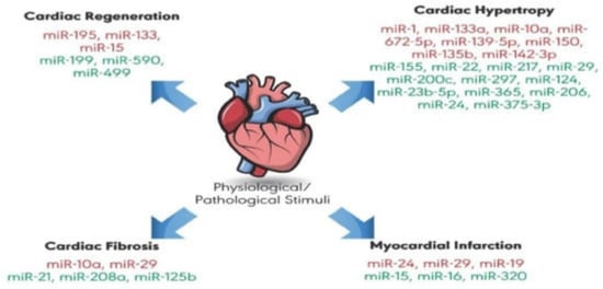 MicroRNAs suggested to play a role in physiological and pathological cardiac remodeling. Some micro RNAs have a protective role (green color) against cardiovascular diseases, whereas others promote extensive cardiac remodeling, leading to disease (red color). Reprinted with permission from [218]. 2019, Int. J. Mol. Sci. is open access journal of MDPI.