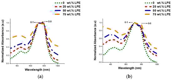 UV-vis spectra of P(DPPTVT) blends with 0–75 wt.% LPE of thin films: (a) before annealing and (b) after thermal annealing at 150 °C for 30 min. Thin films were prepared by solution deposition (spin coating) on a glass slide.