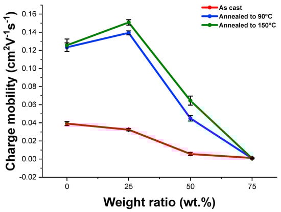 Average charge carrier mobility of different P(DPPTVT):LPE blends for thin films as-cast, after thermal annealing at 90 °C, and after thermal annealing at 150 °C.