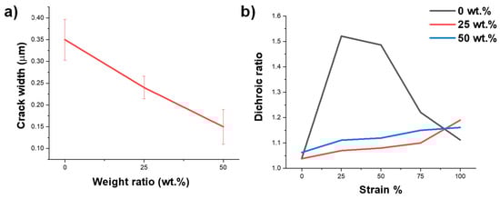 (a) The crack width values extracted from optical and atomic force microscope images of blend films at 100% strain before thermal annealing; (b) dichroic ratios of P(DPPTVT): LPE blends determined by polarized UV-vis spectroscopy.