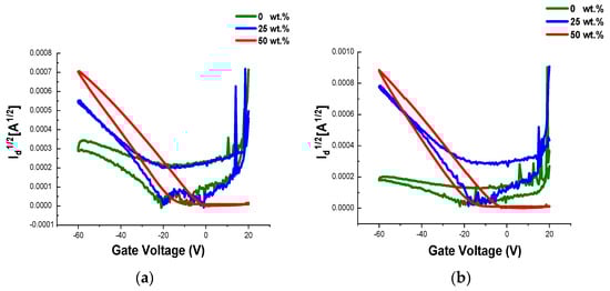 Transfer curves of OFET devices prepared from 0 to 50 wt.% LPE:P(DPPTVT) after stretching at 25% elongation and measured parallel (a) and perpendicular (b) to the device channel. The gate voltage was scanned from 20 to −60 V at Vd = −60 V.