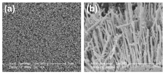 (a) Top-view and (b) cross-sectional SEM images of the bare fabricated CNTs.