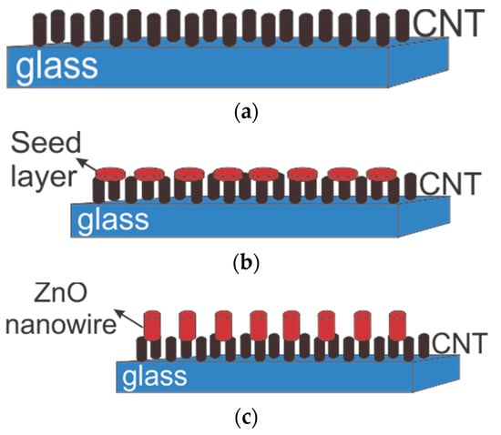 After growing ZnO seeds on CNT, the samples were inserted into a hydrothermal solution in a neutral (glass) container. Then, the container was placed in boiling water, which was warmed by a microwave. It was set for 20–60 min, with 180–850 watts of power to achieve different lengths of ZnO nanowire. The selected conditions were chosen based on the experimental works reported in Ref. [26]. The schematic of the 3-step production method is shown in Figure 2.