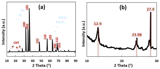 To prove the presence of ZnO and CNT in the obtained CNT-ZnO sample, X-ray diffraction analysis (XRD) was employed. The XRD patterns of the as-prepared sample are presented in Figure 4. In the XRD patterns of the CNT-ZnO composite, the location and intensity of the diffraction peaks that are present at 31.84°, 34.52°, 36.33°, 47.63°, 56.71°, 62.96°, 66.43°, 68.13°, and 69.18° can be indexed into (100), (002), (101), (102), (110), (103), (200), (112), and (201) crystal planes of wurtzite-type hexagonal ZnO (JCPDS No. 65-3411) [27]. Figure 4b illustrates the magnified spectrum of the CNT-ZnO sample before 2 Theta = 30°. This spectrum shows carbon peaks at 12.9°, 23.98°, and 27.9°. These observations indicate that the hexagonal crystalline wurtzite phase of ZnO remains unchanged in the CNT-ZnO sample [28], while peaks related to the planes of graphitic carbon are observed simultaneously in the spectrum [29].