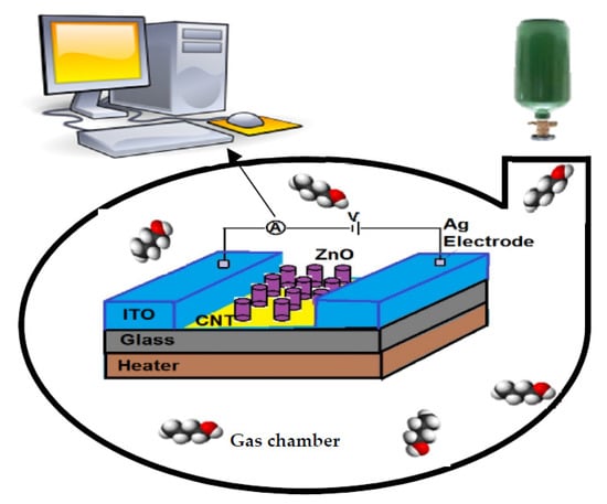 - Xiang, J.; Singhal, A.; Divan, R.; Stan, L.; Liu, Y.; Paprotny, I. Selective volatile organic compound gas sensor based on carbon nanotubes functionalized with ZnO nanoparticles. J. Vac. Sci. Technol. B 2021, 39, 042803. [Google Scholar] [CrossRef]