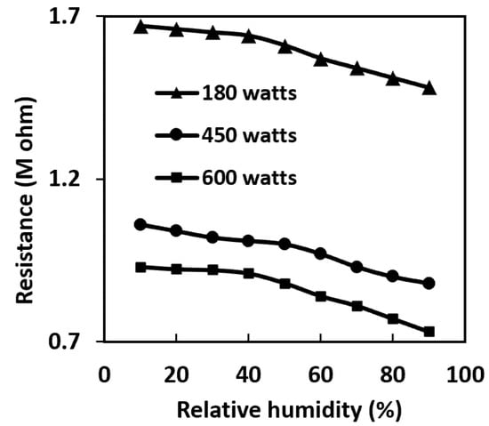 Relative humidity vs. dc resistance plots at room temperature for CNT-ZnO samples with different microwave powers at zero pressure.