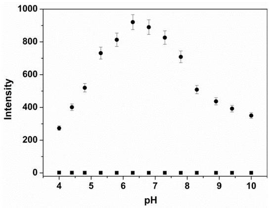 Effect of pH was firstly investigated to evaluate the actual sensing for Cu2+. The results were displayed in Figure 1, when Cu2+ was not added to the P solution, the fluorescence intensity of P itself remained fairly static in the range of pH 4–10. However, after mixing P with Cu2+, the emission intensity gradually increased in the range of pH 4–7, which reached a maximum at pH 6.3. While pH > 7, the fluorescence intensity began to decrease, which tended to the formation of Cu(OH)2 precipitation. Thereby, the pH-control measurements revealed that P was stable in a wide range of pH, which also showed P had the best sensing response to Cu2+ at pH 6.3. All measurements were carried out in alcohol–aqueous media (v/v, 8:2, pH 6.3, 0.02 M HEPES).