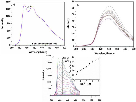 The sensing ability of Cu2+ with P was also checked by the titration experiment with fluorescence spectroscopy. Along with the increasing concentration of Cu2+, the fluorescence intensity at 393 nm and 415 nm enhanced gradually (Figure 3c), which indicated a ratiometric fluorescence change. The linear fitting curve showed that a perfect linear relationship between the ratios of fluorescent emission intensity (I393nm/I415nm) and [Cu2+] within 0.5–8 μM, and LOD (a detection limit) of 0.16 μM was obtained, respectively. It exhibited that probe P could be used for qualitative and quantitative sensing of Cu2+, and the sensitivity reached 30 μM Cu2+ in drinking water in the standard of the WHO (World Health Organization) [30].